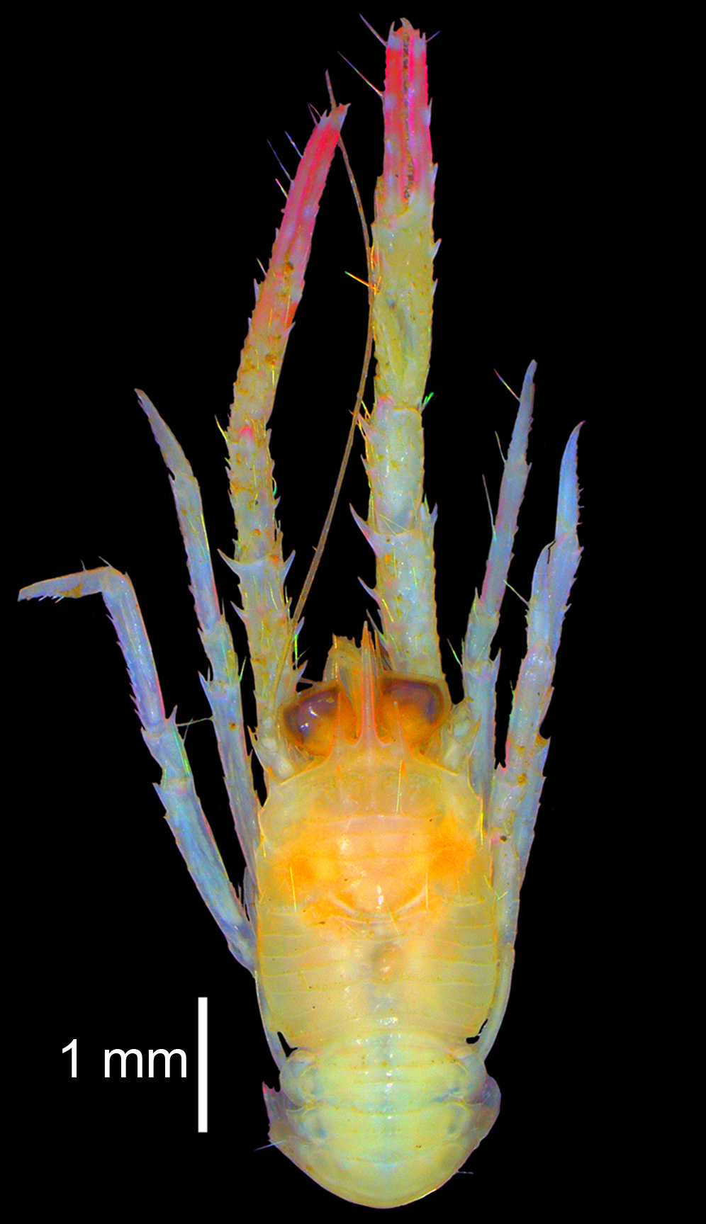 Description: Carapace with 5 or 6 pairs of epigastric spines; 1 parahepatic, 1 anterior branchial, and 1 postcervical spines; frontal margin gently oblique; anterolateral spine not reaching sinus between rostrum and supraocular spines; branchial margin with 4 spines. Anterior margin of thoracic sternite 4 wide, contiguous to median one-third of posterior margin of sternite 3; sternite 7 with patch of numerous granules on each lateral portion extending onto posterior part of sternite 6. Pleomere tergites 2 and 3 each with 2 transverse ridges; tergite 2 with 4 pairs of small low spines on anterior ridge, posterior ridge uninterrupted, unarmed. Antennular peduncle article 1 slightly overreaching distal corneal margin; distal marginal spines unequal in size, distomesial spine shorter than disto lateral spine; lateral margin with distal spine overreaching distolateral spine. Antennal peduncle not reaching distal margin of cornea; article 1 with distomesial spine at least reaching distal margin of article 3; article 2 with distomesial spine overreaching distal margin of article 4, distolateral spine slightly overreaching distal margin of article 3, mesial margin with small spine; articles 3 and 4 unarmed. Mxp3 merus with 2 spines on flexor margin, proximal spine much larger than distal spine. P1 about 3.0 times PCL, surfaces squamose, bearing iridescent setae; merus length 5.4–6.3 times width; palm length 2.6–2.7 times width, fixed finger with 2 spines on proximal half and 2 sub terminal spines on lateral margin; dactylus slightly longer than palm, with 2 short spines proximally and subterminally on mesial margin. P2–4 dactyli 0.8–0.9 length of propodi, flexor margins each with 6–8 corneous spines on nearly entire length and slender subterminal spine closely appressed to terminal unguis.